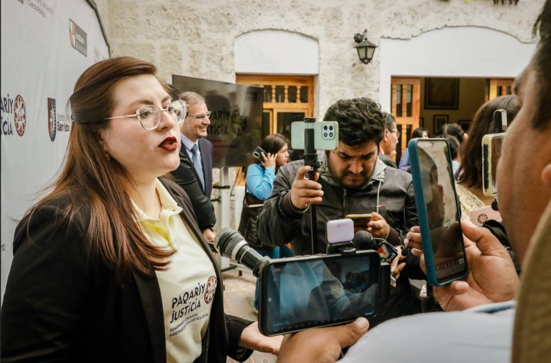 Directora del proyecto Paqariy Justicia y docente UCSP, Mgtr. Katleen Morales dando declaraciones a los medios de comunicación.