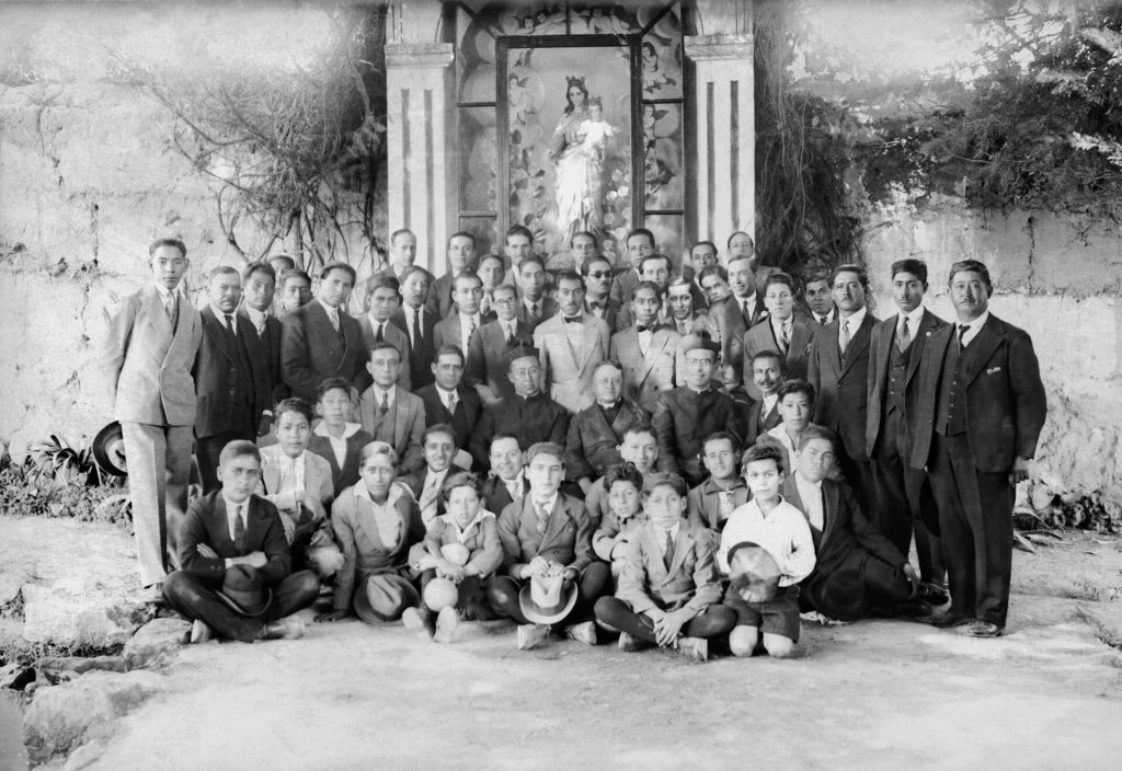 Souvenir portrait of teachers and students next to the Virgin's grotto. Unidentified school.
