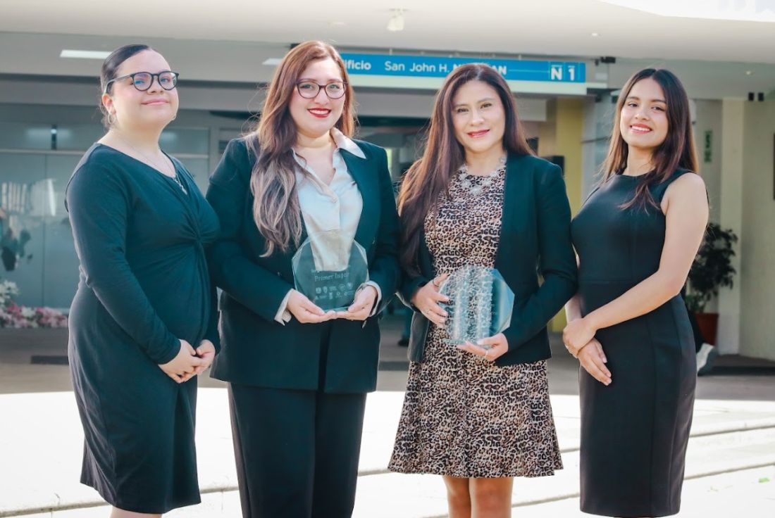 Estudiante de Derecho UCSP, Nora Villasante Medina; abogada Claudia Ximena Tejada Pacheco, egresada de la UCSP; Mtra. Devora Franco García, directora del Círculo de Estudios de Derecho Constitucional y Derechos Humanos Francisco de Vitoria UCSP y la estudiante de Derecho UCSP, Alessa Soza Vela muestran los premios ganados en México.